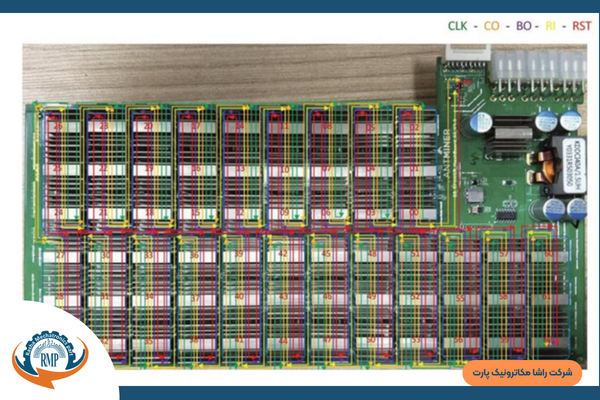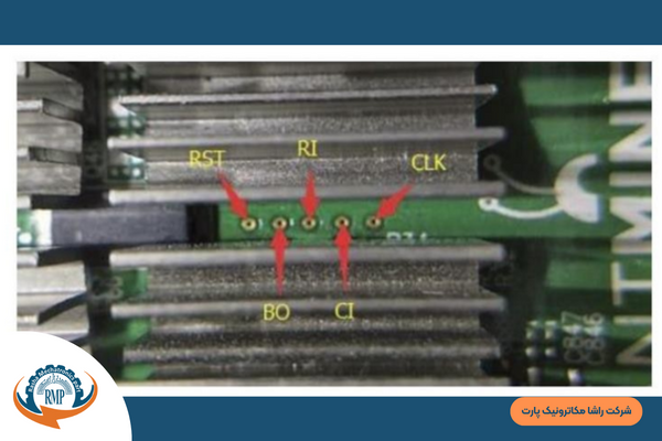 در کنار هر asic تعدادی تست پوینت به نامهای CLK, BO, CO, RST وجود دارد که هر کدام سیگنال و فرکانس عبوری از هر asic را نشان میدهد