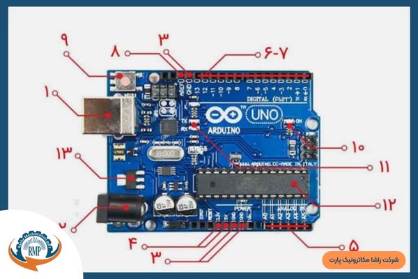 موارد زیر، اجزایی اصلی هستند که تقریبا در تمام بردهای آردوینو موجود اند. برای نمونه، اجزای یک برد آردوینو UNO را بررسی میکنیم. سایر بردهای آردوینو نیز کم و بیش مشابهاند و با کمی دقت میتوانید شباهتها و تفاوتهای آن را پیدا کنید.